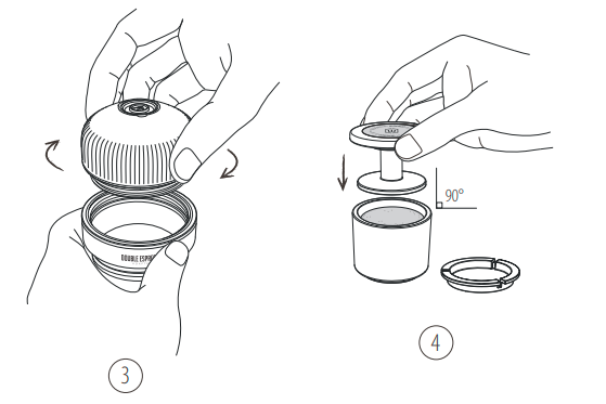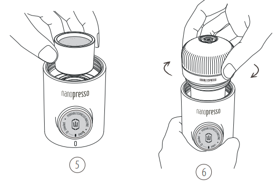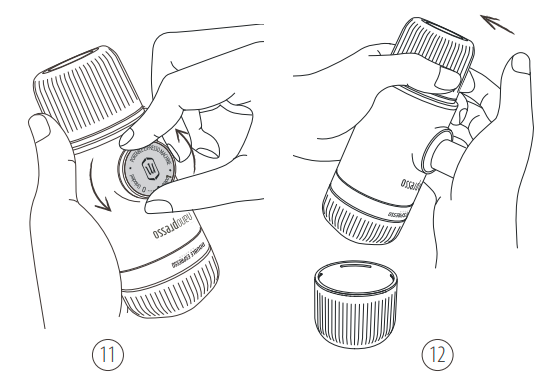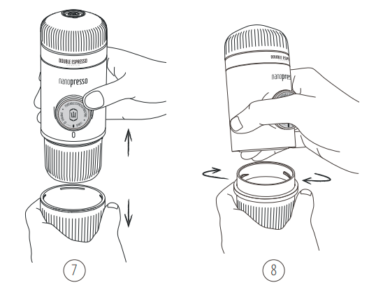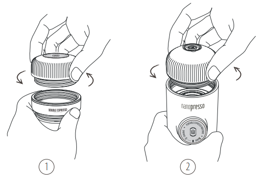 11. Déverrouillez le piston de sa position de déplacement. 12. Tenez le NanoPresso à deux mains, comme indiqué. Commencez à pomper au-dessus d'une tasse. Pompez lentement jusqu'à ce que tout le café sorte. | ![]() |