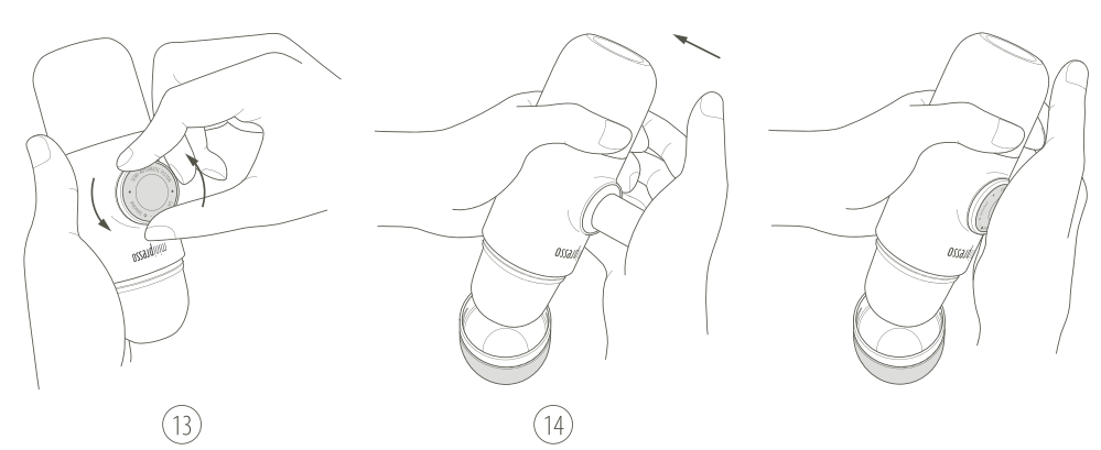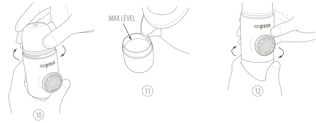 12. Vissez fermement le corps principal sur le réservoir d'eau jusqu'à la butée. Évitez de vous brûler. Manipulez avec précaution.