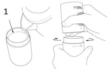 Remplissez le réservoir d'eau en fonction du risque. Alignez le corps de votre MiniPresso avec le point du réservoir et placez-le sur le réservoir en le tournant dans le sens des aiguilles d'une montre.